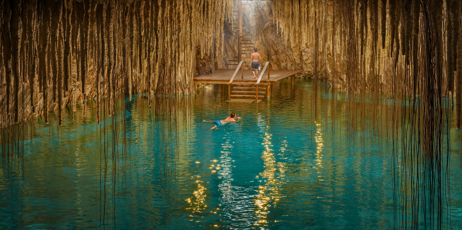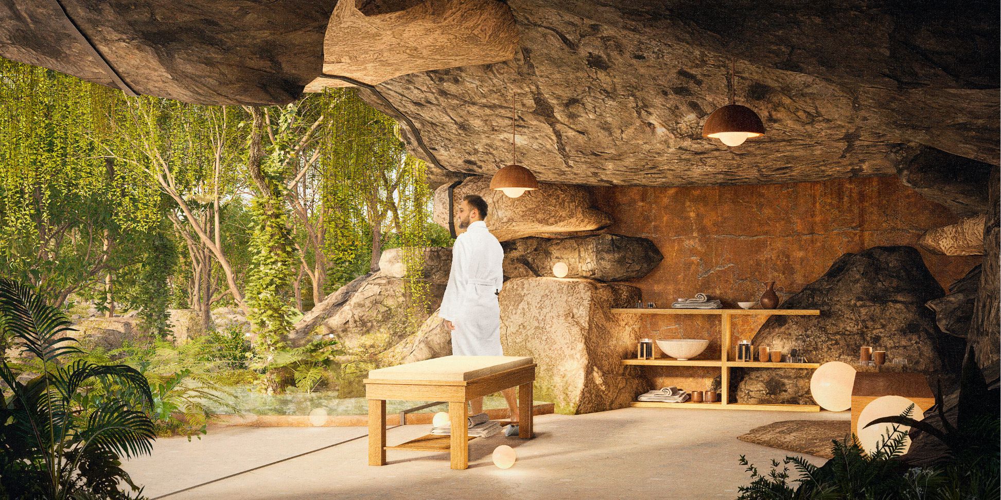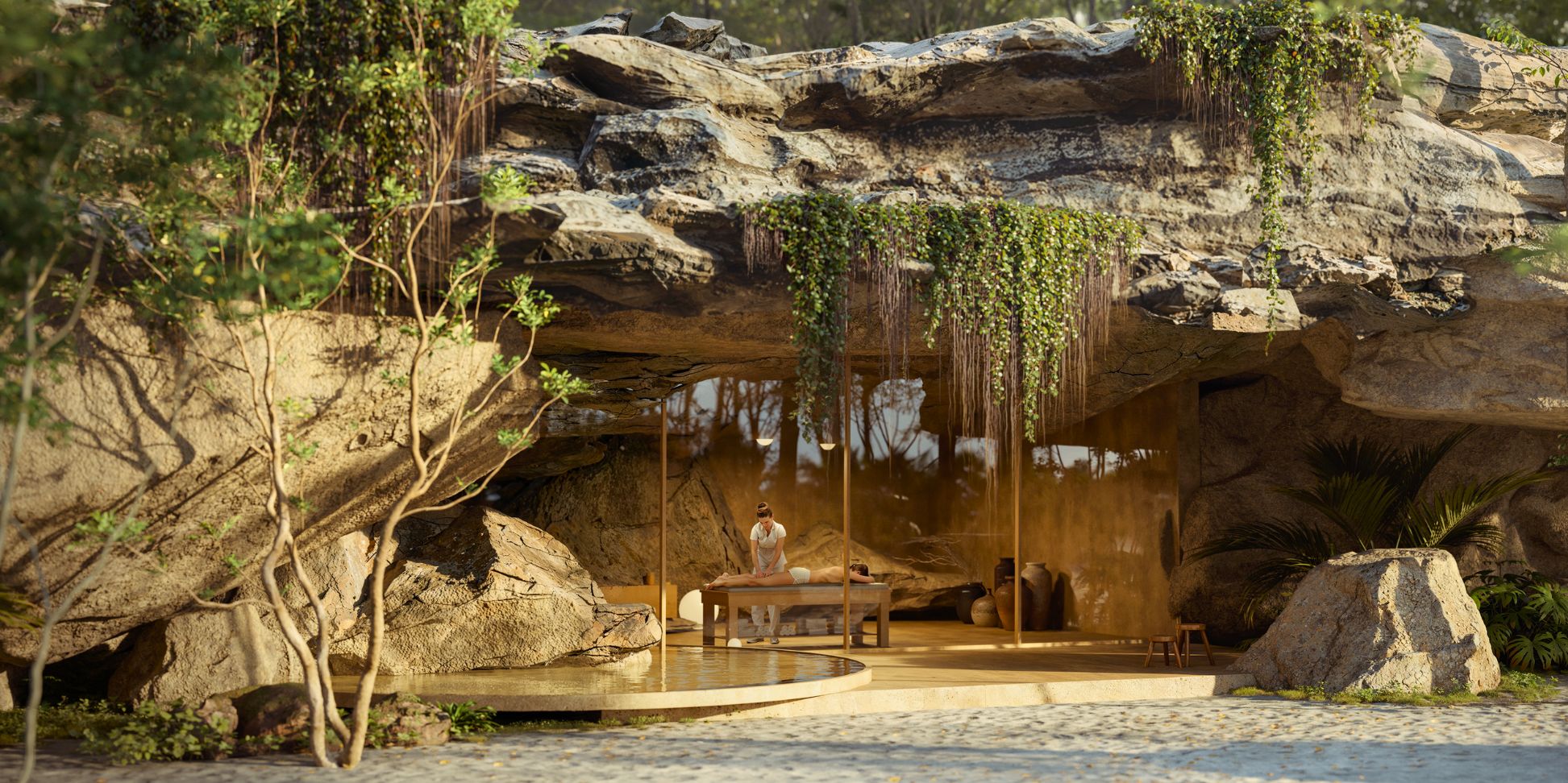 El área wellness, enclavada en el interior de una majestuosa roca dentro de un cenote, ofrece una experiencia de bienestar profundamente conectada con la naturaleza. Este refugio exclusivo combina la serenidad del agua cristalina con la solidez de la roca, creando un espacio íntimo y protegido donde el cuerpo y la mente pueden rejuvenecerse.