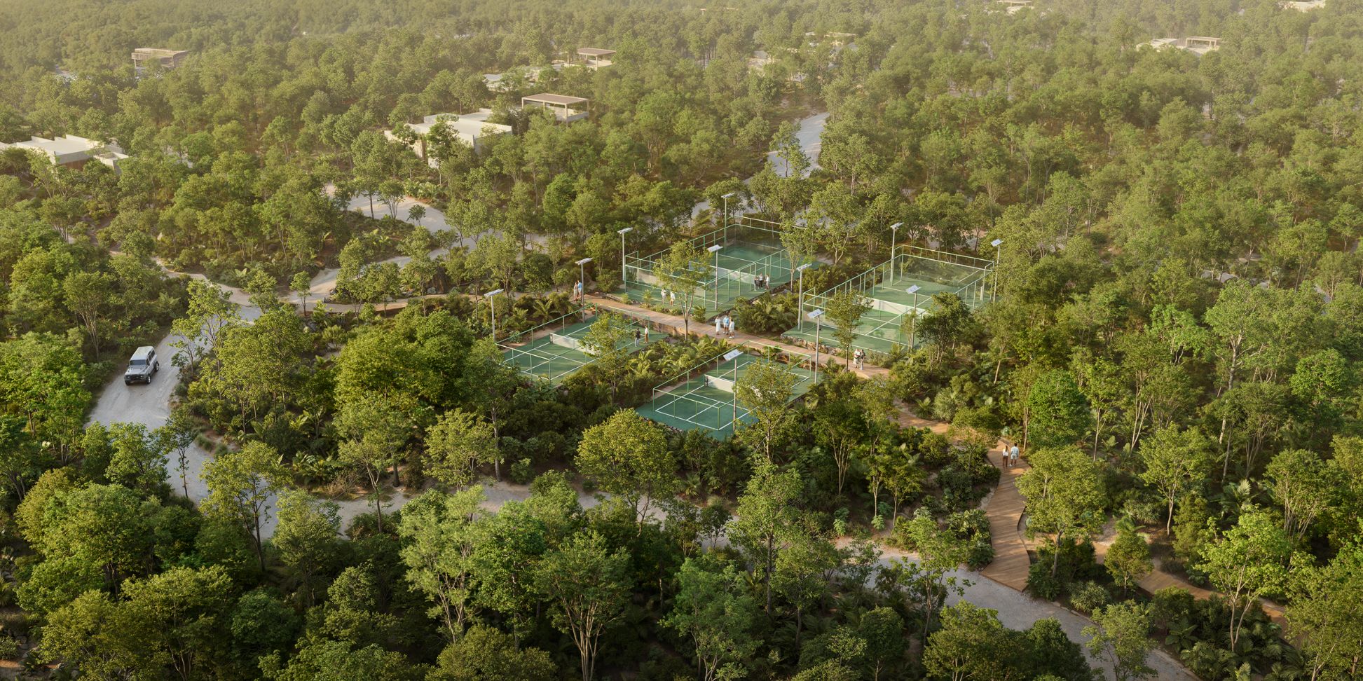 Las canchas de pádel, situadas en medio de la selva, ofrecen una experiencia deportiva única en un entorno natural inigualable. Estas instalaciones están diseñadas para integrarse perfectamente con el paisaje. Rodeadas de altos árboles y vegetación tropical, las canchas proporcionan un espacio fresco y revitalizante para disfrutar del juego, con vistas panorámicas de la naturaleza que enriquecen cada partido.
