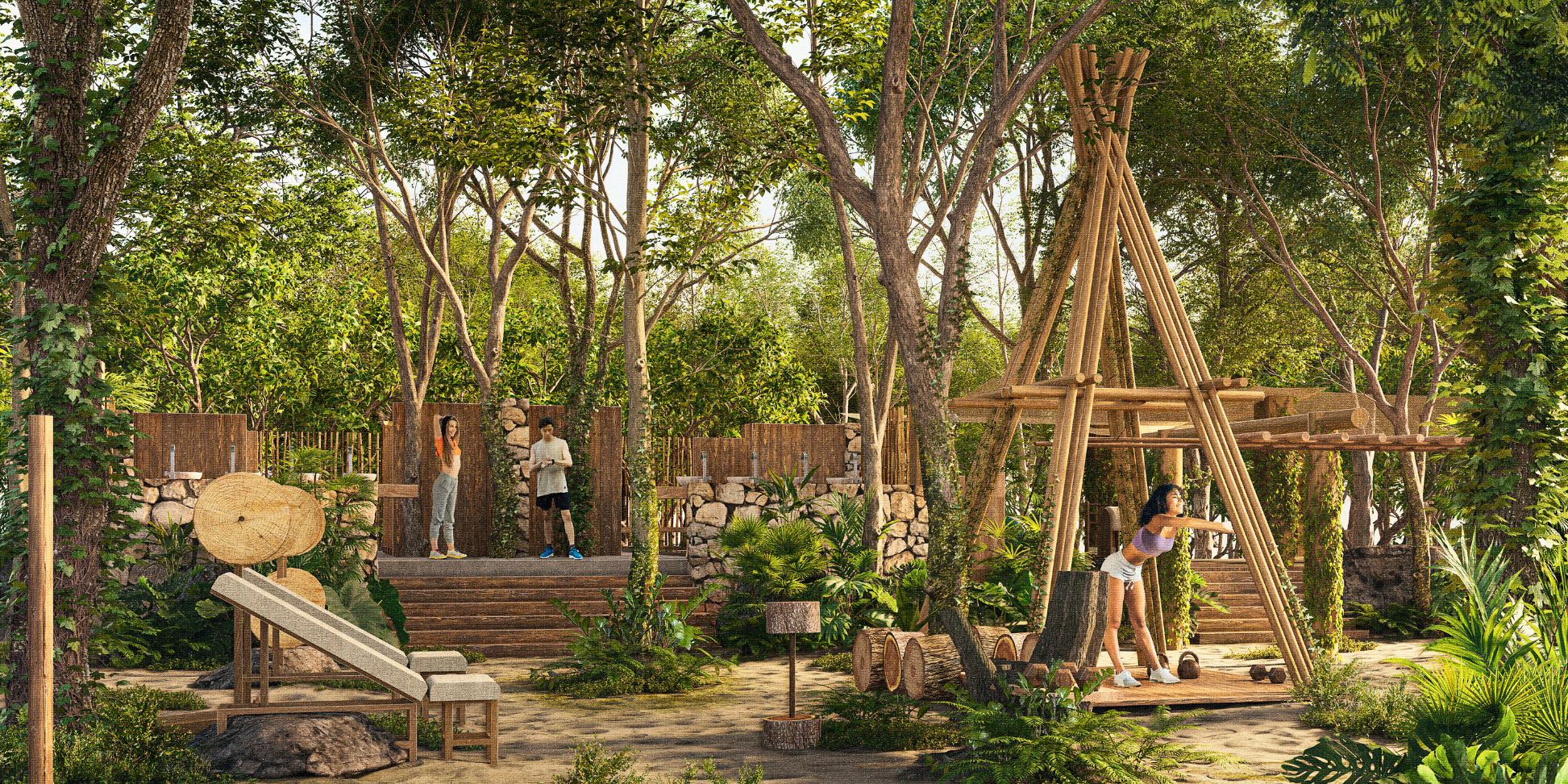 Es un espacio de fitness diseñado para fusionarse con el entorno natural de Selvadentro. Cada aparato del Jungle Gym, desde los columpios hasta las estructuras para escalar, está hecho con materiales del sitio, garantizando tanto durabilidad como una integración armónica con la vegetación.